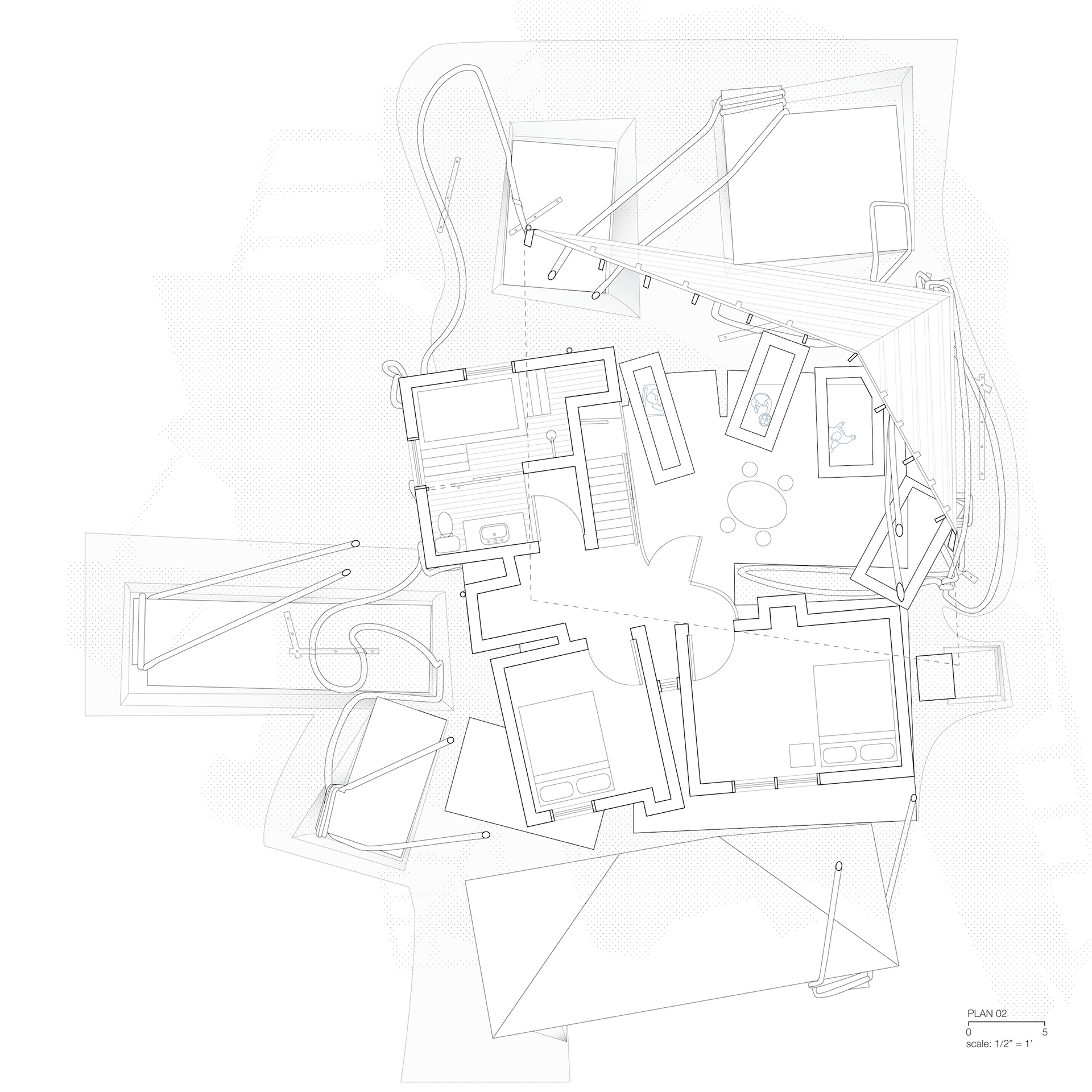 This project deals with material scenography and material misbehavior with the ropes acting as scenographic implements. The ropes are scenographic in nature because 1) the material it is meant to represent is typically inert, and usually not used in a structural capacity and 2) the ropes are not actually holding any part of the house together. While the ropes appear to be arresting the motion of the shifted forms, there is technically friction within the model so it is at rest.