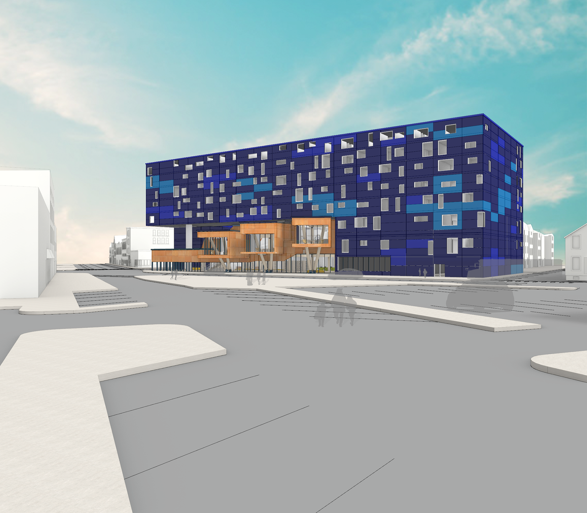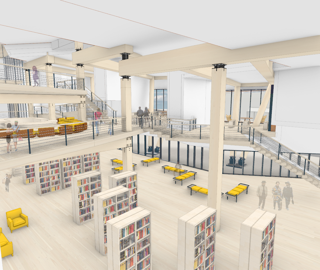 Structurally the design uses steel columns, beams, and decking in the apartments---a large spanning truss is used to support the cantilever. The main structure of the library consists of CLT and massing timber units. We chose to expose the massing timber in the library to allow for a large welcoming space that provides a warm, safe feeling.